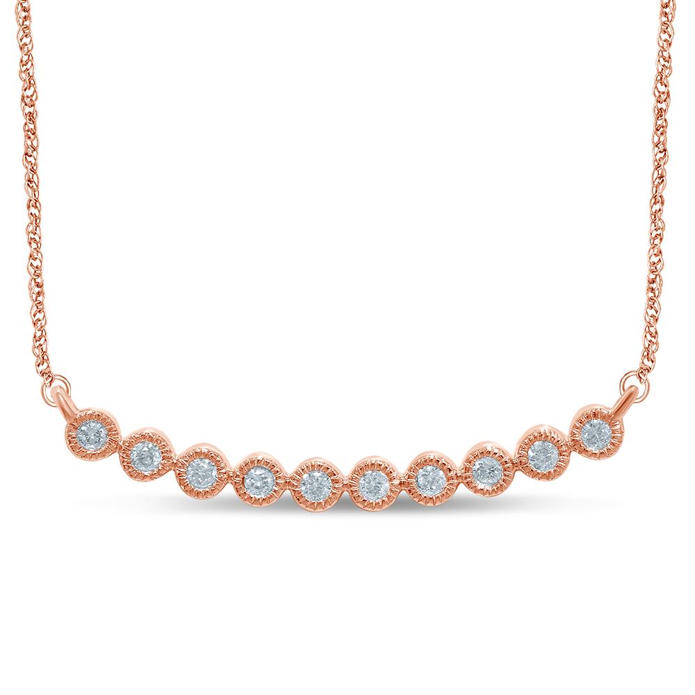 This Amazing Necklace Is Available In 14K Rose Gold. There Are 10 Round Diamonds With A Total Carat Weight Of 1/6 Ct Set In A Bezel Setting.