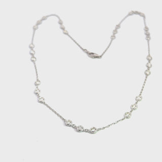 Individually bezel round brilliant cut diamonds evenly spaced along the 18" length of the necklace, each connected with a solid gold chain, ending with a strong clasp.